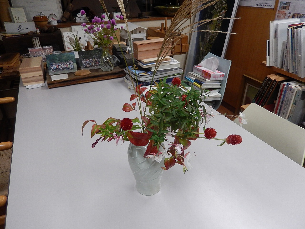 野花 大阪 2015.11.02 建て主さんでもある近所のおばちゃんからたくさん野花をもらってしまった!売ってない花の感じが素敵です。大阪から設計を進めている住まいのご夫婦が当方事務所を訪ねてくれました。 アラカシのどんぐりを拾って来ました。トチ、ナラガシワ、コナラ、シバグリ、フユガキ、アケビ他、今年はたくさん 鉢に植えています。