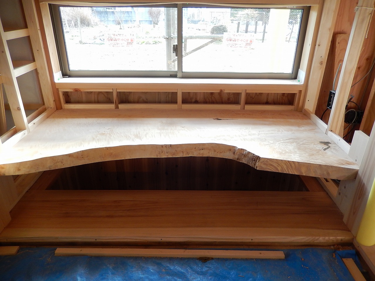 高島の住まい 畳の間の寝室 窓際に掘り込みのテーブルを納めました。絹の様な光沢に魅かれる栃の木です。高島の製材所 山田木材さんから。