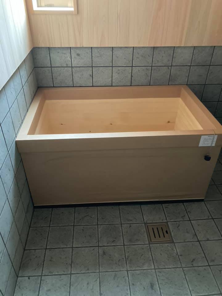 進行中の住まい 浴室が出来てきました。今年三軒目の木の浴槽、肌触り、香り、保温性、サスティナブル、雑で素で単純 石の上に木の桶をおくだけ。素敵の価値が一緒の幸せ。