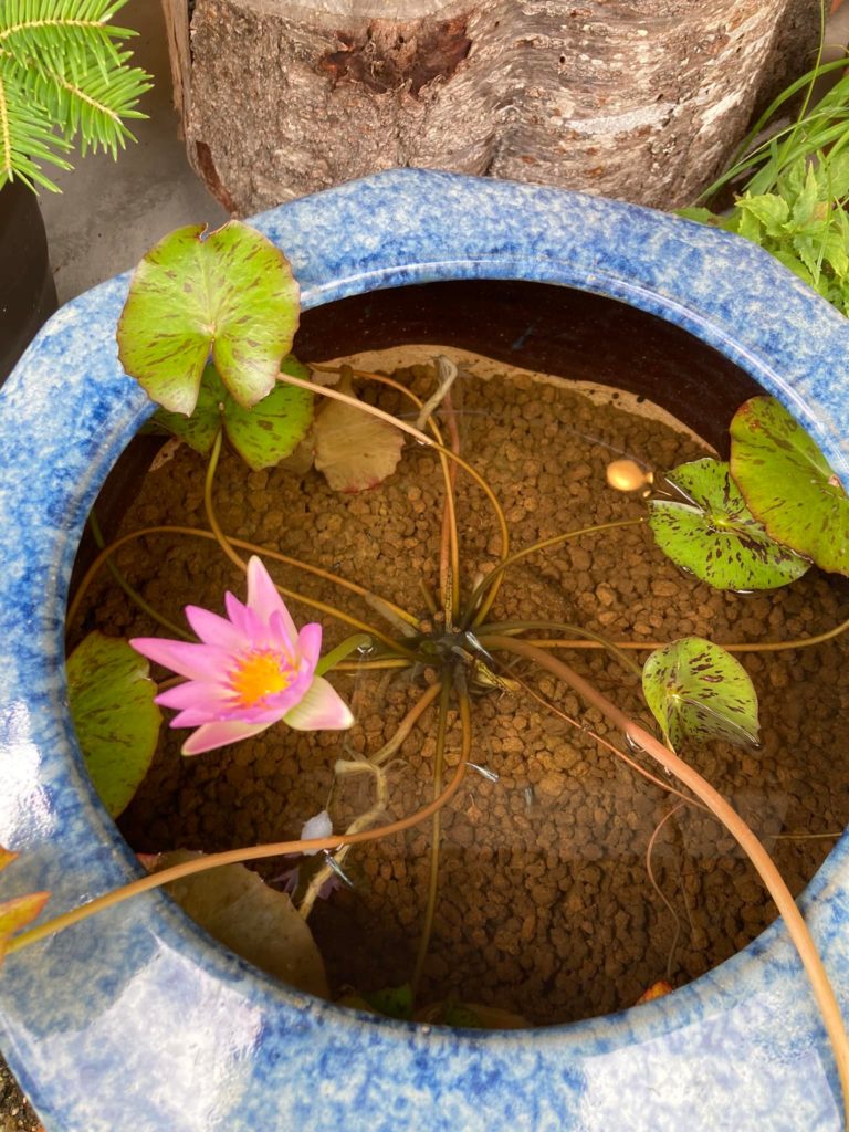 どこかで拾ってきた火鉢に土と水を入れ小さな宇宙を。メダカの排泄物が、睡蓮の養分になり美しい水のまま。今日 花が咲きました。ロンには、何の事か 多分。