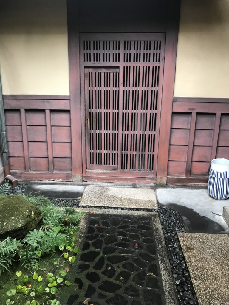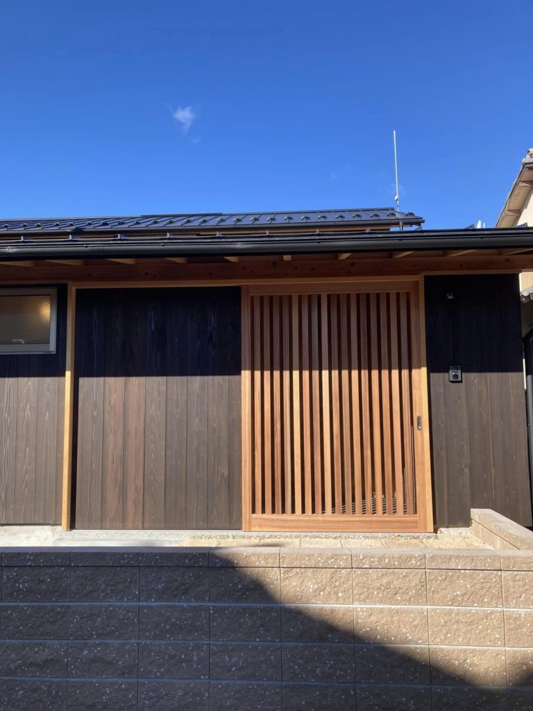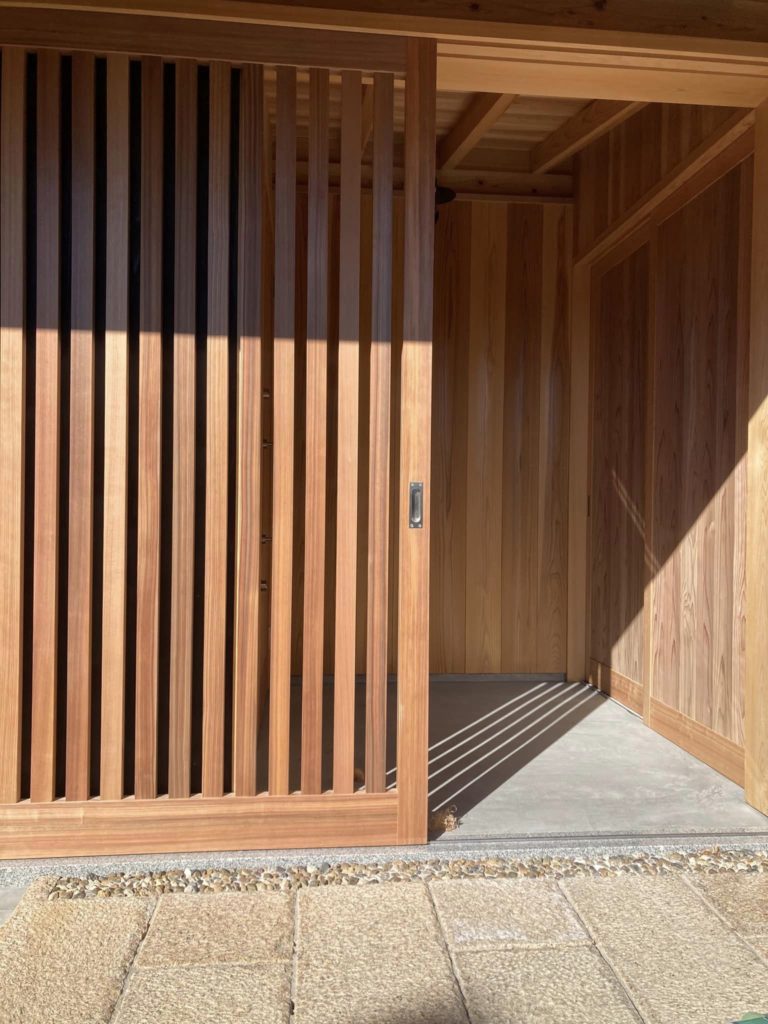 間も無く引き渡す住まい、外玄関、の格子戸が完成。開けると右手は、外収納、土間収納です。左手に本玄関のドア。奥ゆかしい京町屋のアプローチを湖西滋賀 若い依頼主宅で写しています。だんだんと家に帰る仕掛け。