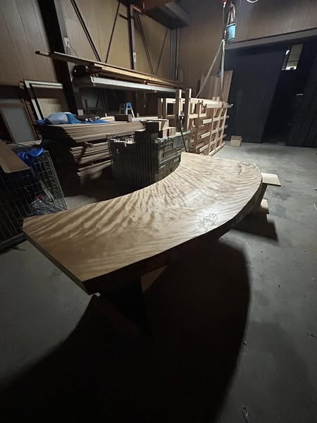 一枚板の明日 2025.09.17 一枚板のテーブル 天然オイルでフィニッシュしました。沖縄へ旅立ちます。この人、間違い この木は素敵だ!と思って市場で競った桜の木、当社工場から出て行くのは、どこか哀しいもの。末永く。
