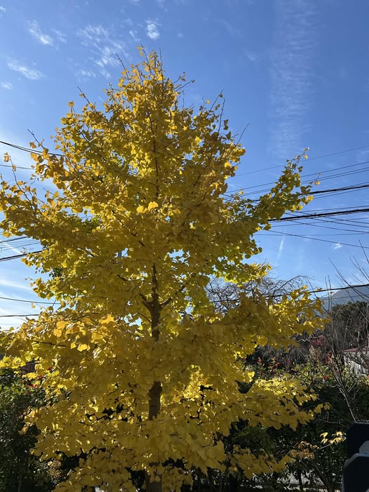 しあわせ 2025.11.24 朽木の奥山の林業家 栗本さんからいただいた銀杏の種、10年経ち、ボロボロの本社の前に花が、枯葉が咲いて来ました。嬉しい。昨晩 愛媛の馬のお祭りの番組をNHKで。子供が馬に乗り参道を駆ける!、祭りの後 馬乗りを教えた主の言葉が素敵だった、その時は厳しく指導したけど、何年か後に この牛舎に会いに来てくれる、僕は仕合せです と。