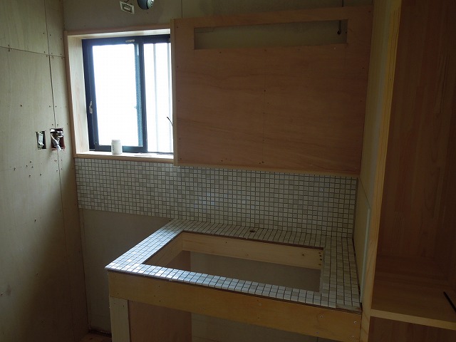 リフォーム進行中の住まい。洗面カウンターを制作中です。またもや実験用シンクです。正面 鏡の中に照明器具を組む予定。楽しみの灯り。ヤマギワ出身の施主さん。