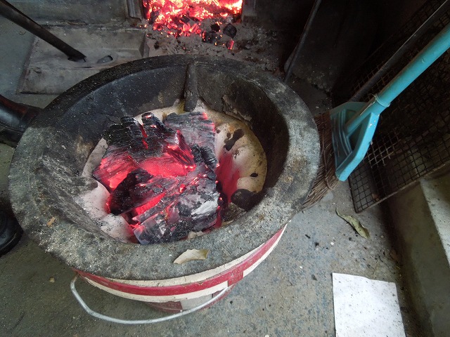 お風呂が、沸くと 熾きを引き火力を調整、炭壺に入れたり、七輪に移し煮炊きに。