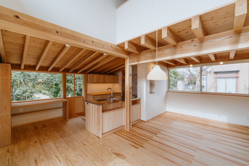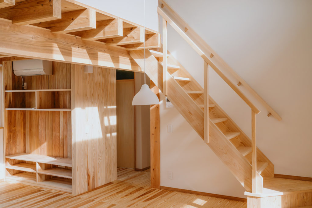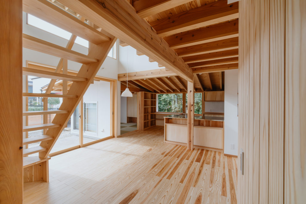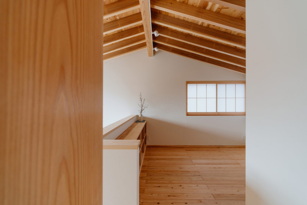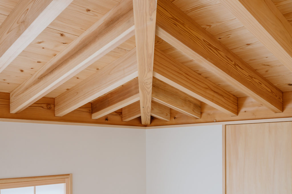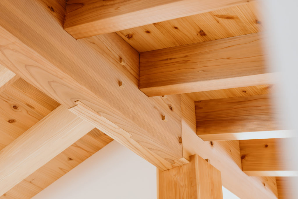 室内にもふんだんに木材を使用し、手刻みの家ならではのあたたかみのある仕上がりになっています。窓から見える木々はたおやかに靡き、それに呼応して木の優しさがほのかにそよぐ住まいです。