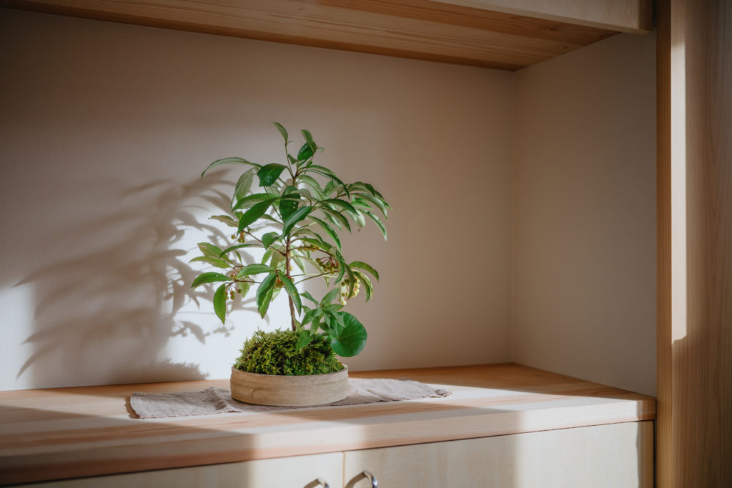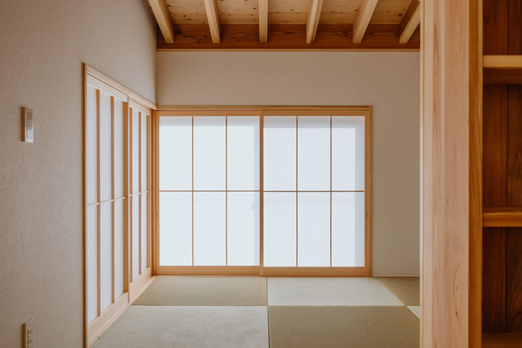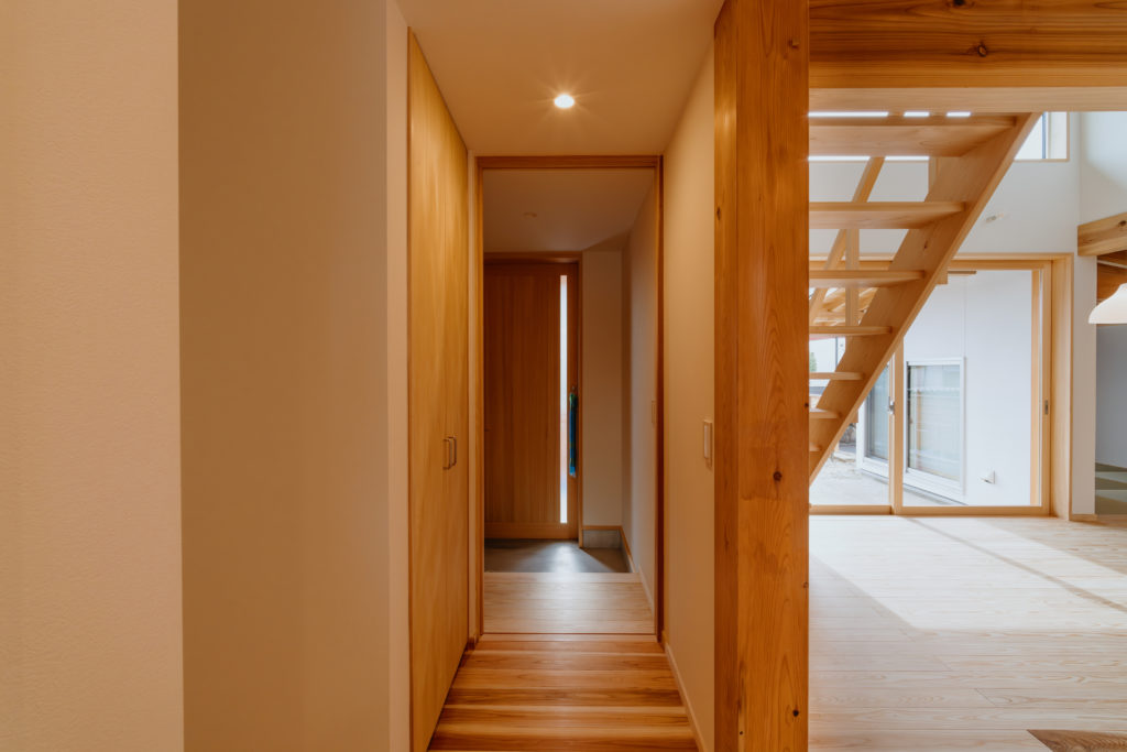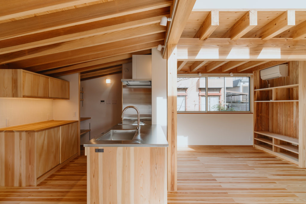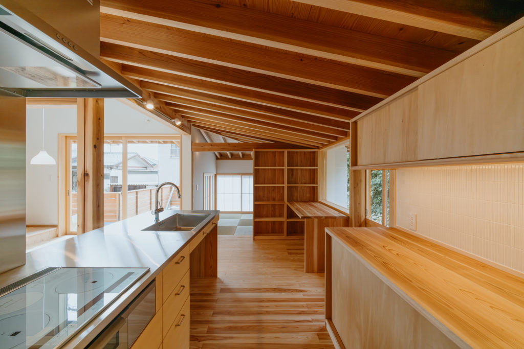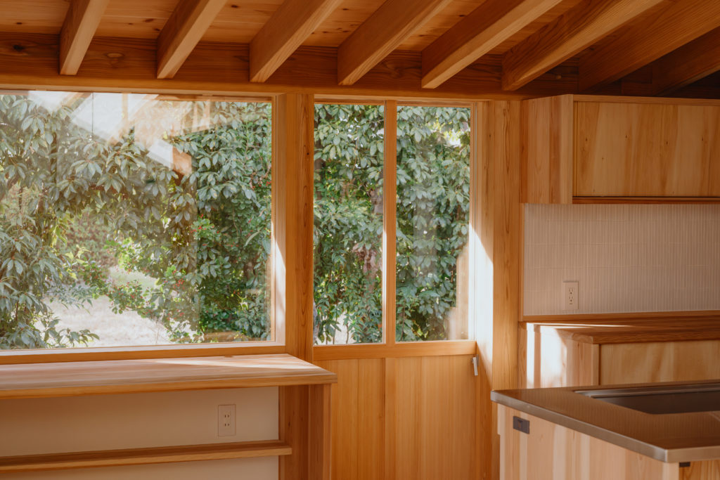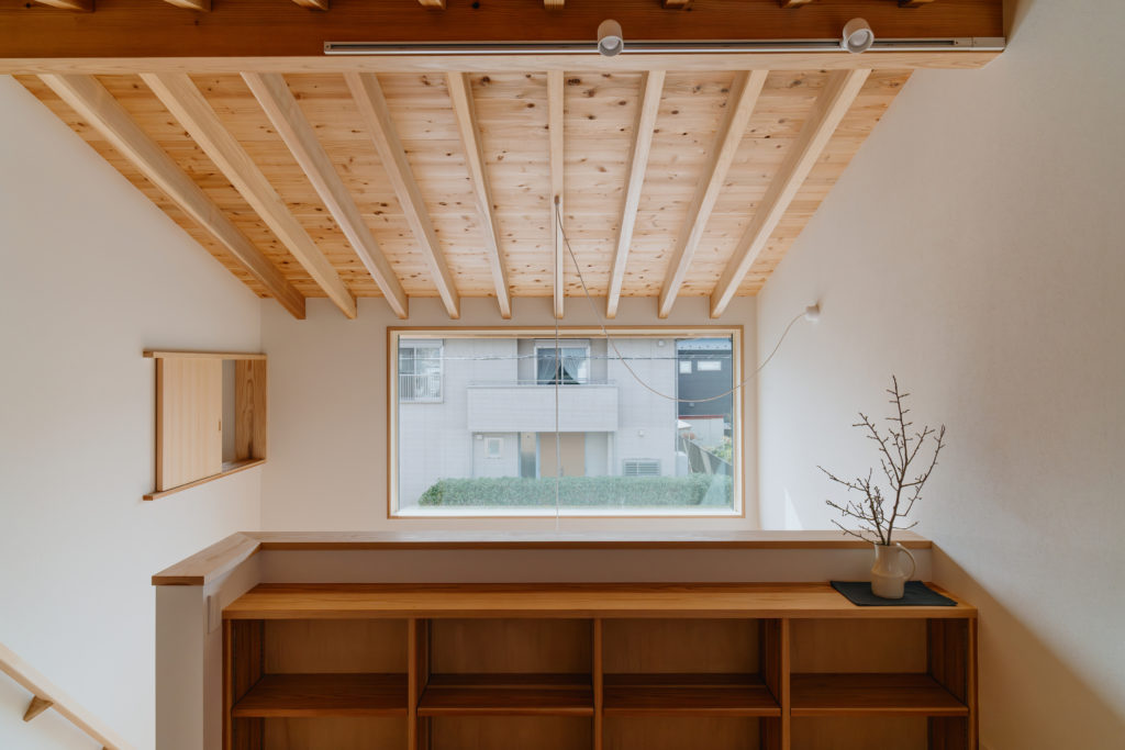 室内にもふんだんに木材を使用し、手刻みの家ならではのあたたかみのある仕上がりになっています。窓から見える木々はたおやかに靡き、それに呼応して木の優しさがほのかにそよぐ住まいです。