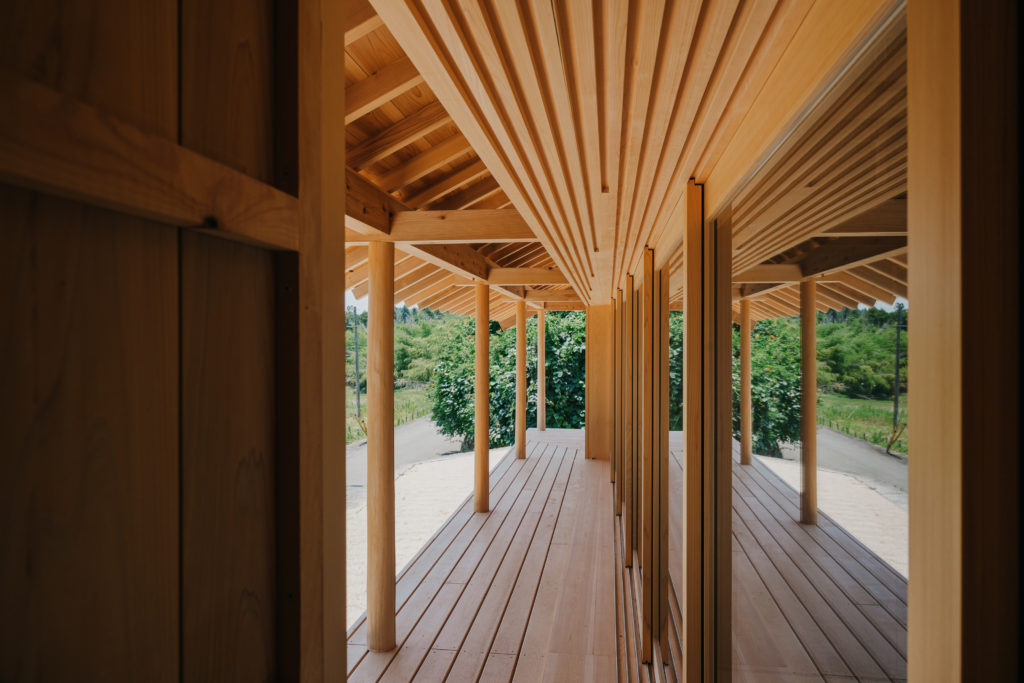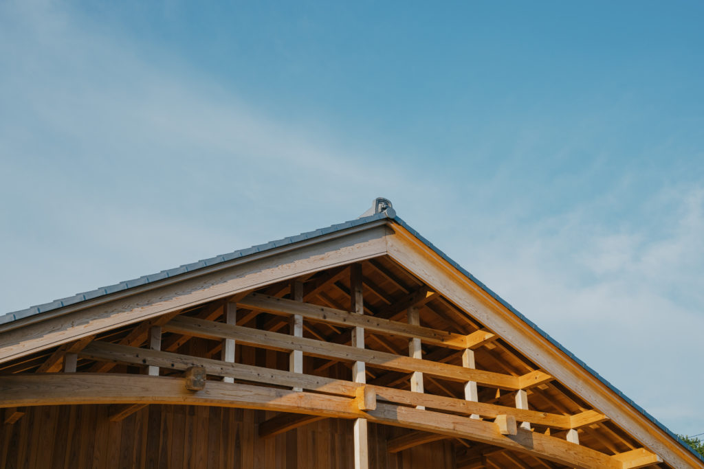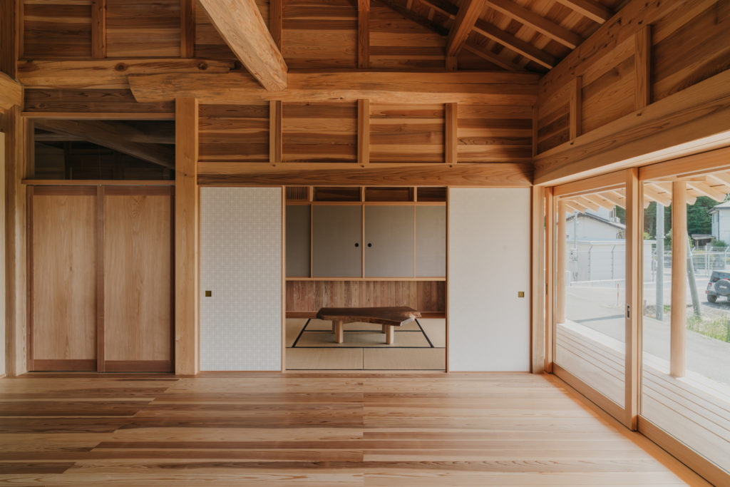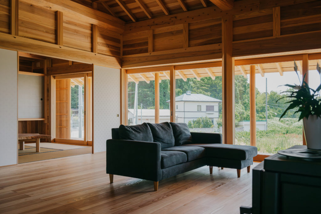 いぶし銀の瓦が青空に良く映え、板貼りと美しい構造がひときわ目を惹く平屋です。少し道より上がった土地に建てられているため、道の先でこの家が出迎えてくれているような存在感を放っています。大きなデッキとそこに繋がる回廊のような縁側が建屋を囲み、伸びやかながらも重心のある出で立ちです。板倉工法を用い、木材をふんだんに使用したことで、家に入った瞬間に木の香りがする本当の木の家となりました。